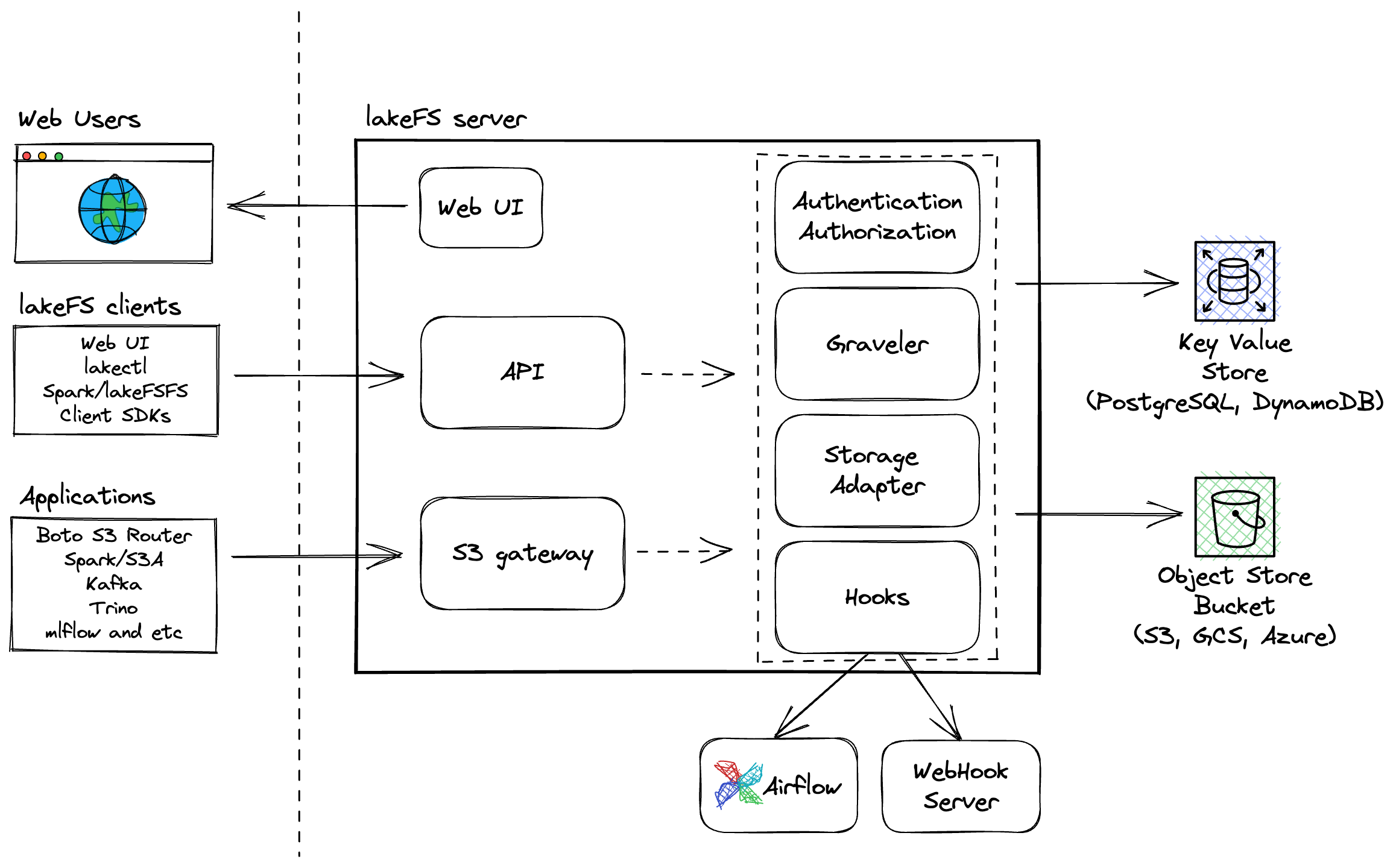 lakeFS is distributed as a single binary encapsulating several logical services.
