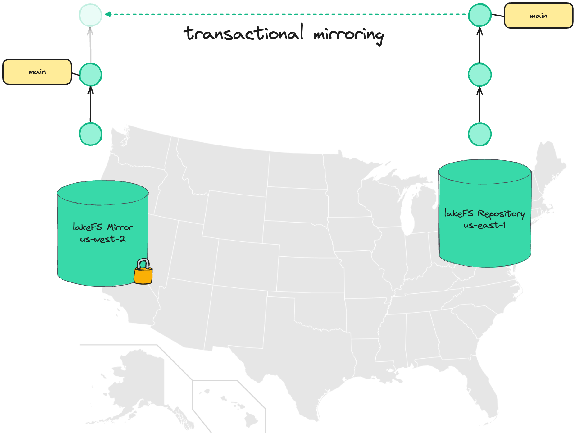Transactional Mirroring in lakeFS allows replicating a lakeFS repository ("source") into read-only copies ("mirror") in different locations.